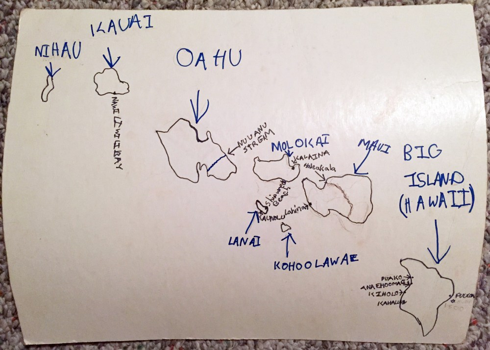 Andy Woodruff estimates he was around seven when he made this map of Hawaii, based on when his dad was stationed there with the Air Force, plus the handwriting and spelling on the map. “A couple of those islands are spelled wrong,” he says. “But I’m pretty sure adults would spell a lot of those wrong too.”