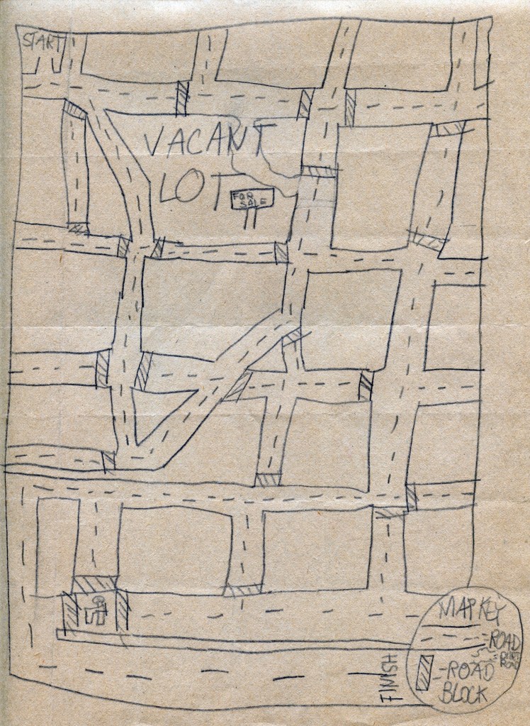 Watching the Dukes of Hazzard may have been what inspired Eric Fischer to draw this map when he was around seven years old. “Because where else would all these road blocks and stuff have come from?” he asks.