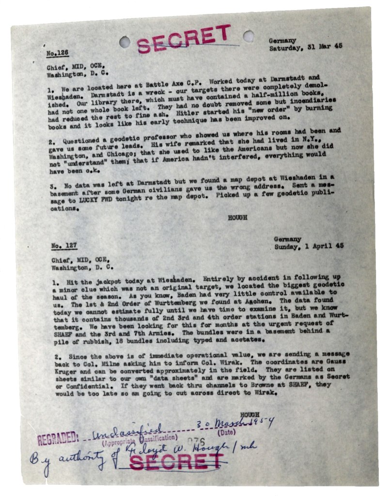 In Wiesbaden, a city just to the west, their luck began to improve. In the basement of one building, they found 18 bundles of survey data, hidden behind a pile of rubbish. Marked “Secret” or “Confidential” in German, the sheets covered thousands of survey points in southwestern Germany. The data had immediate operational value for the U.S. Seventh Army, which was beginning to push its way across the Rhine into that area. Hough decided to shortcut the chain of command to get the information directly to the artillery units that could use it.